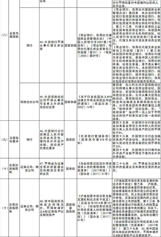 至于上海的金融《指引》,在去年就有傳聞要年內(nèi)落地。在去年6月的陸家嘴論壇上,上海市金融服務(wù)辦公室主任鄭楊表示,近期上海自貿(mào)區(qū)將逐步探索、研究并推出金融業(yè)負(fù)面清單,并爭(zhēng)取年內(nèi)“出爐”,“開放市場(chǎng),對(duì)內(nèi)和對(duì)外兩方面都要開放。對(duì)內(nèi)開放,要推動(dòng)金融服務(wù)業(yè)對(duì)符合條件的民營(yíng)資本開放,支持符合條件的民營(yíng)資本依法設(shè)立民營(yíng)銀行、金融租賃公司、財(cái)務(wù)公司,包括金融消費(fèi)公司?!?br/>本次《指引》表單部分列明了外資投資設(shè)立金融機(jī)構(gòu)管理(市場(chǎng)準(zhǔn)入限制)和外資準(zhǔn)入后業(yè)務(wù)管理措施(國(guó)民待遇限制)兩方面共10個(gè)類別、48項(xiàng)特別管理措施,具體包括股東機(jī)構(gòu)類型要求、股東資產(chǎn)規(guī)模要求、股東經(jīng)營(yíng)業(yè)績(jī)要求、資本金要求、股權(quán)結(jié)構(gòu)限制、分支機(jī)構(gòu)設(shè)立與運(yùn)營(yíng)要求、其他金融機(jī)構(gòu)準(zhǔn)入限制、業(yè)務(wù)范圍限制、運(yùn)營(yíng)指標(biāo)要求以及交易所資格限制。