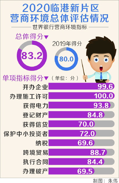 世界銀行營商環(huán)境指標(biāo)評估包括10個指標(biāo),從企業(yè)全生命周期視角衡量區(qū)域在商事監(jiān)管領(lǐng)域的便利化水平。報告指出,基于現(xiàn)階段評估情況,臨港新片區(qū)總體得分為83.2分,相對其他經(jīng)濟體處于較領(lǐng)先的位置;比去年同期(2018年5月至2019年5月)上升3.2分。