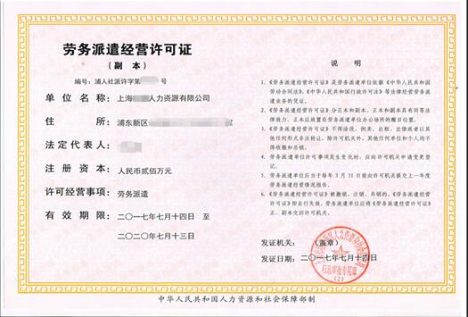 2.一個流程下來40天左右就可以拿到嶄新的《勞務派遣經營許可證》正副本、營業(yè)執(zhí)照正副本、公司一套章、(公章、法人章、財務章),接下來就看各位老板各顯身手了。在這給大家展現(xiàn)一下最新的《勞務派遣經營許可證》的模板參考一下,謝謝!